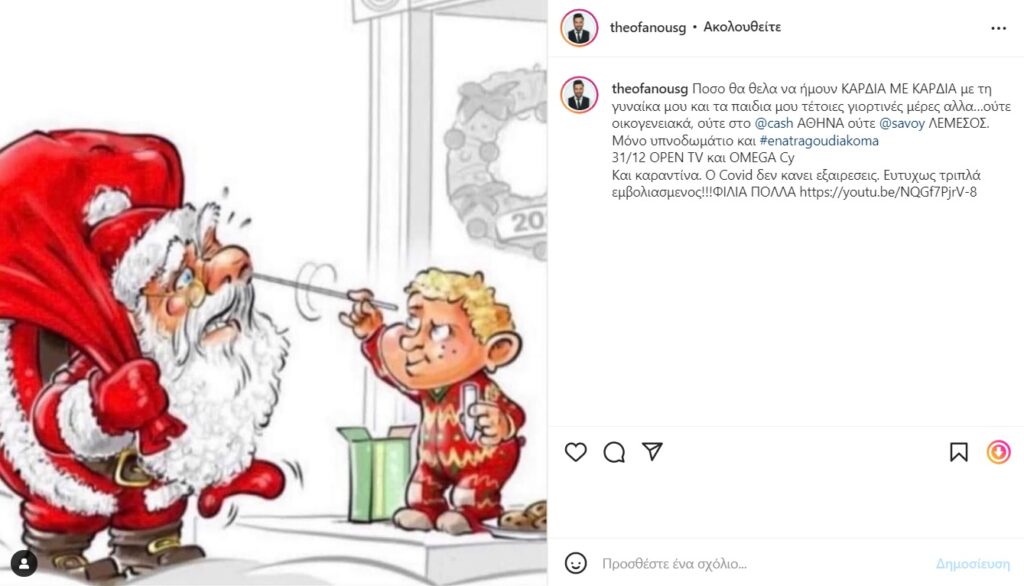 «Πόσο θα ήθελα να ήμουν ΚΑΡΔΙΑ ΜΕ ΚΑΡΔΙΑ με τη γυναίκα μου και τα παιδιά μου τέτοιες γιορτινές μέρες αλλά…ούτε οικογενειακά, ούτε στο cash ΑΘΗΝΑ ούτε savoy ΛΕΜΕΣΟΣ. Μόνο υπνοδωμάτιο και #enatragoudiakoma 31/12 OPEN TV και OMEGA Cy. Και καραντίνα. Ο Covid δεν κάνει εξαιρέσεις. Ευτυχώς τριπλά εμβολιασμένος!!!ΦΙΛΙΑ ΠΟΛΛΑ» έγραψε ο Γιώργος Θεοφάνους στην ανάρτησή του.