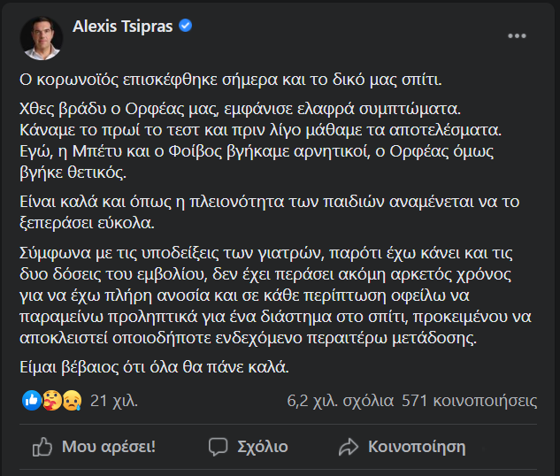 Με μία ανάρτηση στον προσωπικό του λογαριασμό στο facebook, ο Αλέξης Τσίπρας ανακοίνωσε ότι ο γιος του Ορφέας διαγνώσθηκε θετικός στον κορονοϊό.