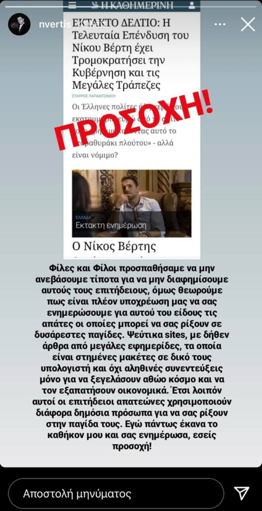 «ΠΡΟΣΟΧΗ! Φίλες και φίλοι προσπαθήσαμε να μην ανεβάσουμε τίποτα για να μη διαφημίσουμε αυτούς τους επιτήδειους, όμως θεωρούμε πώς είναι πλέον υποχρέωσή μας να σας ενημερώσουμε για αυτού του είδους τις απάτες οι οποίες μπορεί να σας ρίξουν σε δυσάρεστες παγίδες. Ψεύτικα sites, με δήθεν άρθρα από μεγάλες εφημερίδες, τα οποία είναι στημένες μακέτες σε δικό τους υπολογιστή και όχι αληθινές συνεντεύξεις μόνο για να ξεγελάσουν αθώο κόσμο και να τον εξαπατήσουν οικονομικά. Έτσι λοιπόν αυτοί οι επιτήδειοι απατεώνες χρησιμοποιούν διάφορα δημόσια πρόσωπα για να σας ρίξουν στην παγίδα τους. Εγώ πάντως έκανα το καθήκον μου και σας ενημέρωσα, εσείς προσοχή!», ήταν το μήνυμα του Νίκου Βέρτη.