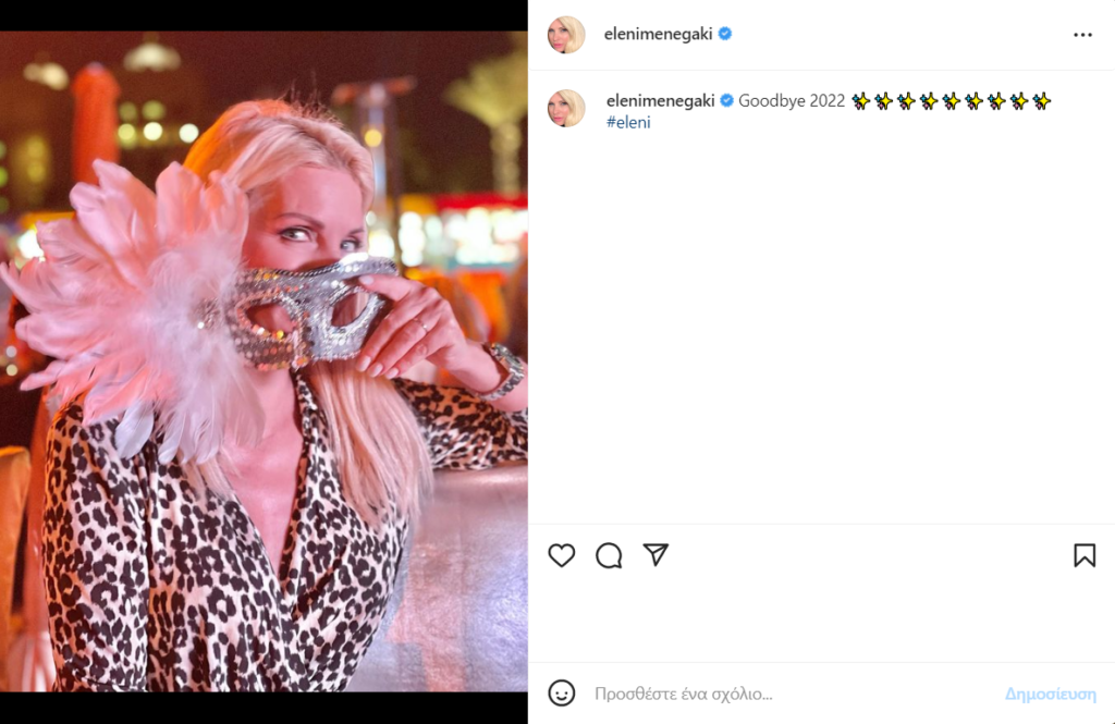 Συγκεκριμένα η Ελένη Μενεγάκη ποζάρει φορώντας μία ιδιαίτερη μάσκα έγραψε στη λεζάντα της: «Goodbye 2022».