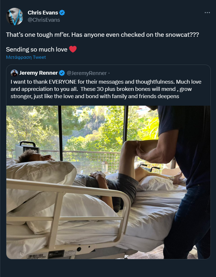 Το χιουμοριστικό μήνυμα του Chris Evans στο Jeremy Renner: «Το εκχιονιστικό μηχάνημα το κοίταξε κανείς;»