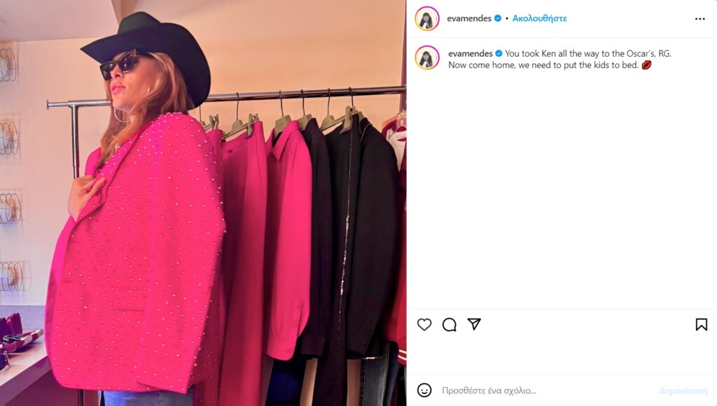 «Πήγες τον Ken μέχρι τα Όσκαρ. Τώρα γύρνα σπίτι, πρέπει να βάλουμε τα παιδιά για ύπνο», έγραψε η Eva Mendes στην λεζάντα της ανάρτησης της