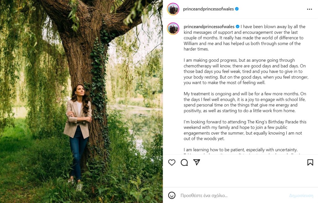 Μια ανάρτηση στον λογαριασμό της στο Instagram, έκανε η Kate Middleton και έγραψε πως η θεραπεία της για τον καρκίνο έχει καλή πρόοδο, ωστόσο υπάρχουν και άσχημες ημέρες.
