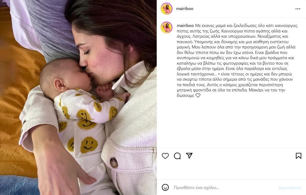 Είναι βράδια που ανυπομονώ να κοιμηθείς για να κάνω δικά μου πράγματα και καταλήγω να βλέπω τις φωτογραφίες και τα βίντεο που σε έβγαλα μέσα στην ημέρα. Είναι όλα παράλογα και εντελώς λογικά ταυτόχρονα… είναι τέτοιες οι ημέρες και δεν μπορώ να σκεφτώ τίποτα άλλο σήμερα από τις μανάδες που χάνουν τα παιδιά τους. Αυτός ο κόσμος χρειάζεται περισσότερη μητρική φροντίδα σε όλα τα επίπεδα. Μακάρι να του την δώσουμε» έγραψε η Μαίρη Συνατσάκη στην ανάρτησή της.