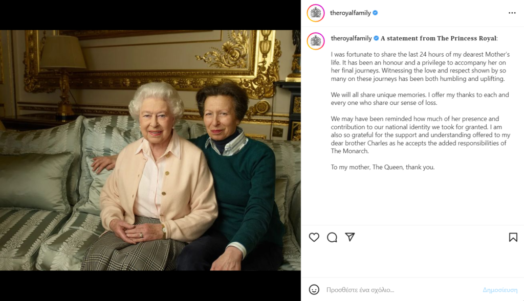Ωστόσο, το πρώτο μήνυμα μετά τον θάνατο της Βασίλισσας έστειλε μέσα από τα social media και η Πριγκίπισσα Άννα.