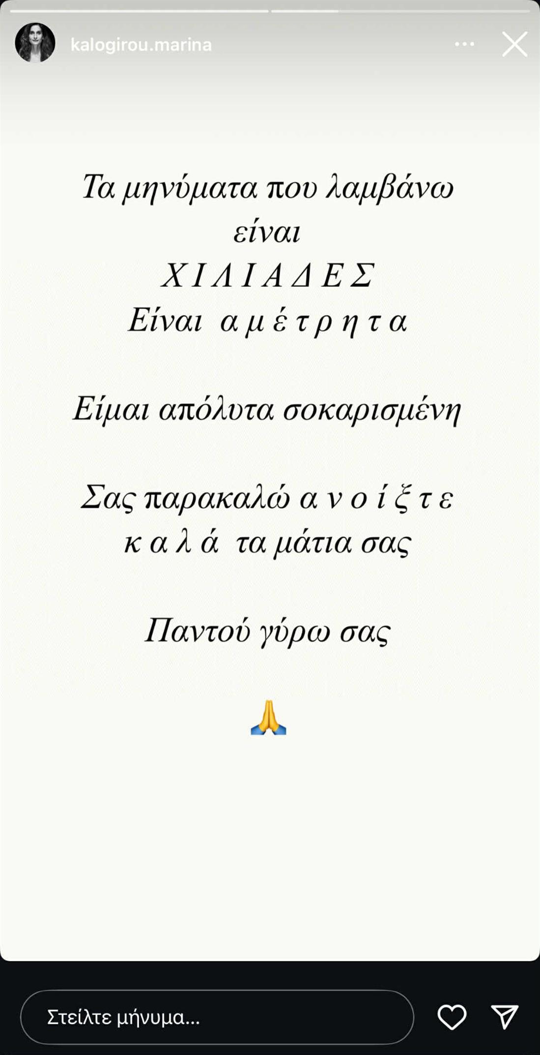 «Τα μηνύματα που λαμβάνω είναι χιλιάδες. Είναι αμέτρητα. Είμαι απόλυτα σοκαρισμένη. Σας παρακαλώ ανοίξτε καλά τα μάτια σας. Παντού γύρω μας», έγραψε η Μαρίνα Καλογήρου στη νέα της ανάρτηση στον προσωπικό της λογαριασμό στο Instagram.