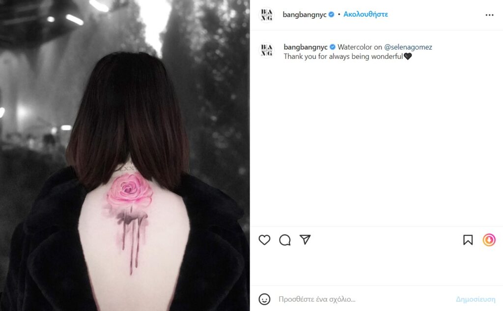 Συγκεκριμένα ο tattoo artist των διασήμων, Bang Bang, με ένα post στο Instagram αποκάλυψε πως το νέο τατουάζ της Gomez είναι ένα τεράστιο λουλούδι στην πλάτη.