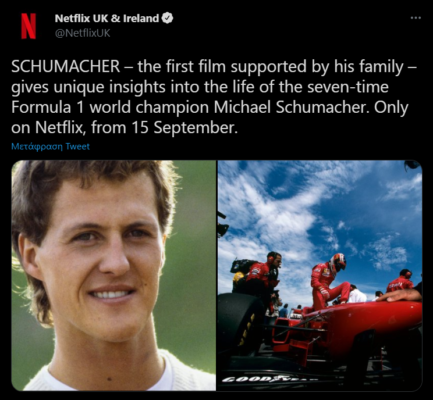 Το ντοκιμαντέρ «Schumacher» για τον θρυλικό πρωταθλητή της F1, Michael Schumacher, ένα βαθιά προσωπικό πορτραίτο μιας εμβληματικής προσωπικότητας που έγραψε ιστορία στον τομέα των μηχανοκίνητων σπορ, θα είναι διαθέσιμο σύντομα στο Netflix.