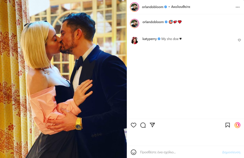 Μάλιστα, ο Orlando Bloom που είναι ιδιαίτερα ενεργός στα social media, θέλησε να μοιραστεί με τους followers του ένα παθιασμένο φιλί με την αγαπημένη του Katy Perry.