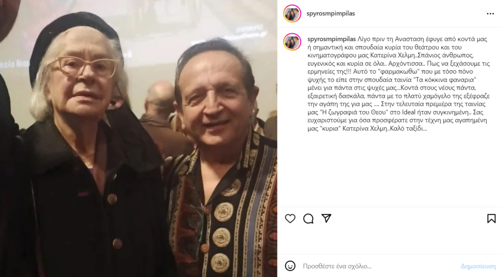 Κοντά στους νέους πάντα, εξαιρετική δασκάλα, πάντα με το πλατύ χαμόγελο της εξέφραζε την αγάπη της για μας …. Στην τελευταία πρεμιέρα της ταινίας μας “Η ζωγραφιά του Θεου” στο Ideal ήταν συγκινημένη.. Σας ευχαριστούμε για όσα προσφέρατε στην τέχνη μας αγαπημένη μας “κυρια” Κατερίνα Χελμη..Καλό ταξίδι…», έγραψε ο Σπύρος Μπιμπίλας στην ανάρτηση του.