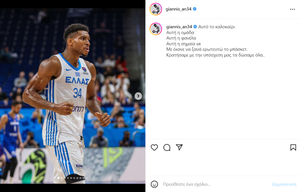 «Αυτό το καλοκαίρι, Αυτή η ομάδα, Αυτή η φανέλα , Αυτή η σημαία, με έκανε να ξανά ερωτευτώ το μπάσκετ. Κρατήσαμε με την υπόσχεση μας τα δώσαμε όλα» έγραψε ο Γιάννης Αντετοκούνμπο, ανεβάζοντας παράλληλα μια σειρά φωτογραφιών με τα γαλανόλευκα.