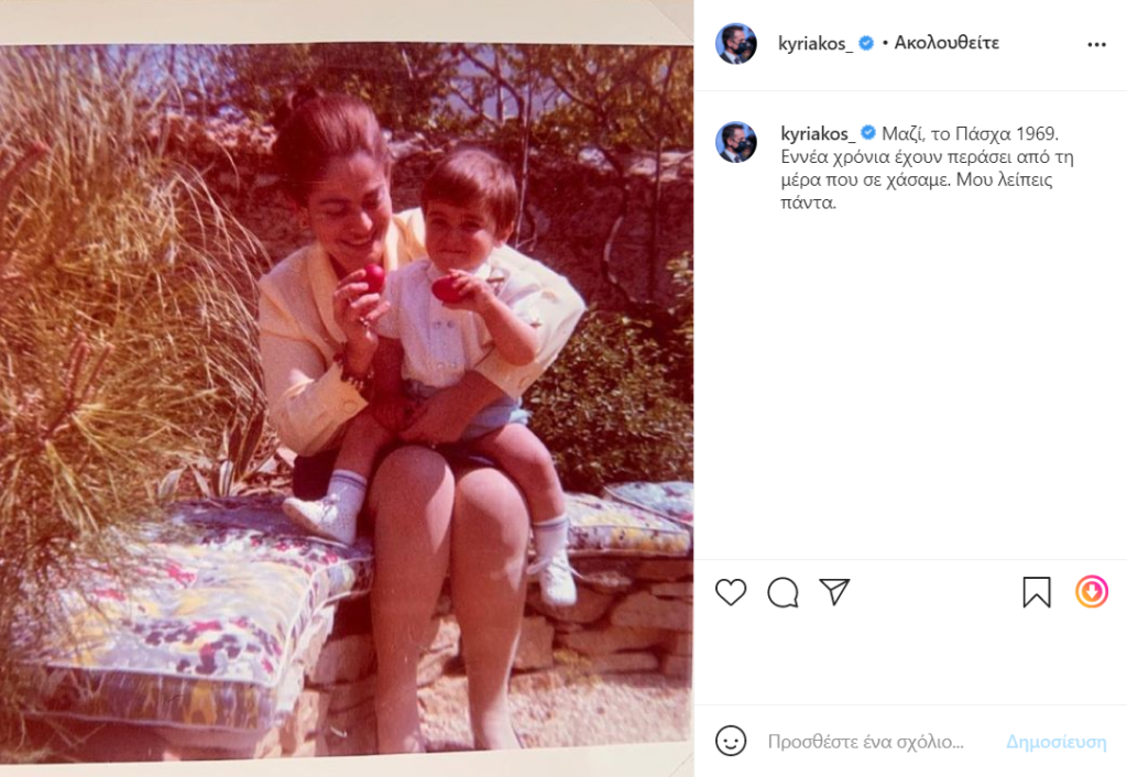 «Μαζί, το Πάσχα 1969. Εννέα χρόνια έχουν περάσει από τη μέρα που σε χάσαμε. Μου λείπεις πάντα» έγραψε ο Πρωθυπουργός στην λεζάντα της ανάρτησης του instagram.