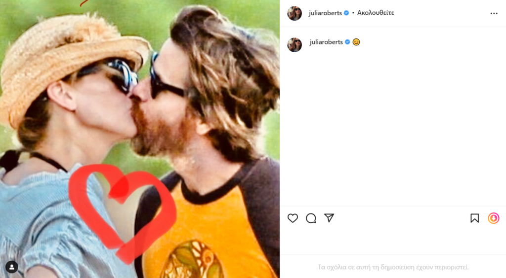 Συγκεκριμένα η Julia Roberts ανέβασε στον προσωπικό της λογαριασμό στο Instagram μία φωτογραφία με τον Danny Moder, όπου δίνουν ένα τρυφερό φιλί.