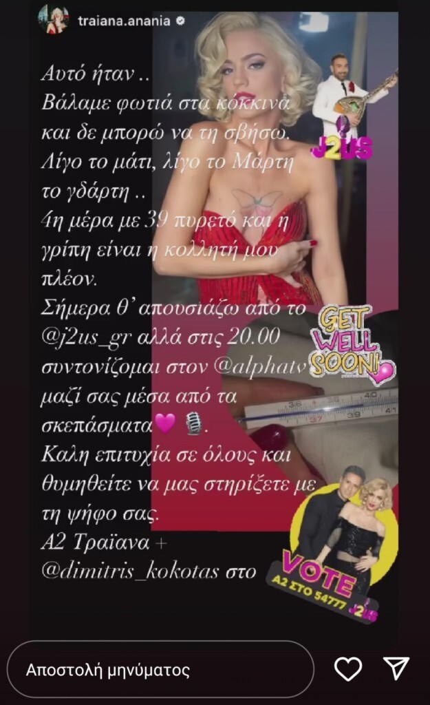 Σήμερα θα απουσιάζω από το J2US αλλά στις 20:00 συντονίζομαι στον Alpha μαζί σας μέσα από τα σκεπάσματα. Καλή επιτυχία σε όλους και θυμηθείτε να μας στηρίξετε με την ψήφο σας. Α2, Τραϊάνα και Δημήτρης», έγραψε η Τραϊάνα Ανανία στην ανάρτησή της.