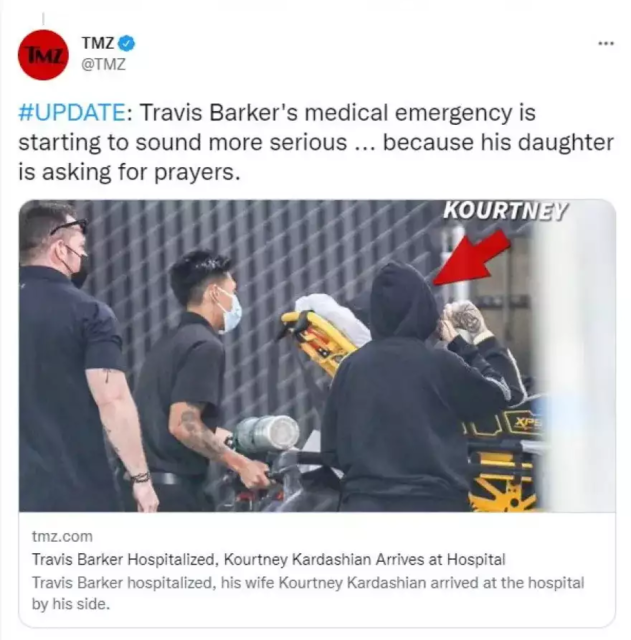 Σύμφωνα με πληροφορίες του «TMZ» σε φωτογραφίες που τραβήχτηκαν κατά τη διάρκεια της μεταφοράς του, ο Barker φαίνεται να μεταφέρεται με φορείο, ενώ η Kourtney τον ακολουθεί μαζί με το ιατρικό προσωπικό.