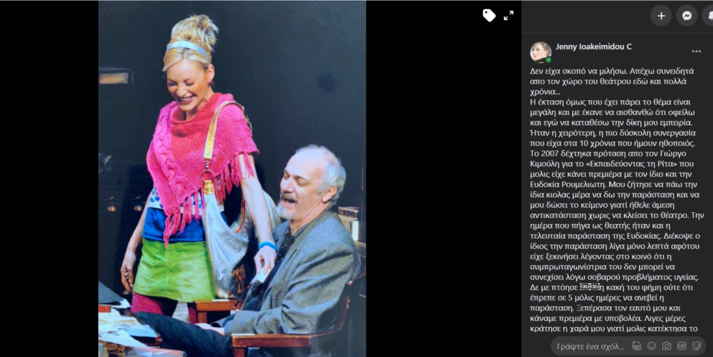«Δεν είχα σκοπό να μιλήσω. Απέχω συνειδητά από τον χώρο του θεάτρου εδώ και πολλά χρόνια… Η έκταση όμως που έχει πάρει το θέμα είναι μεγάλη και με έκανε να αισθανθώ ότι οφείλω και εγώ να καταθέσω την δίκη μου εμπειρία. Ήταν η χειρότερη, η πιο δύσκολη συνεργασία που είχα στα 10 χρόνια που ήμουν ηθοποιός.