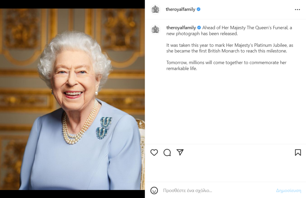 Ωστόσο, λίγες ώρες πριν την κηδεία της Βασίλισσας Ελισάβετ, το Παλάτι του Μπάκιγχαμ έδωσε στη δημοσιότητα τα μεσάνυχτα της Κυριακής την τελευταία επίσημη φωτογραφία της.