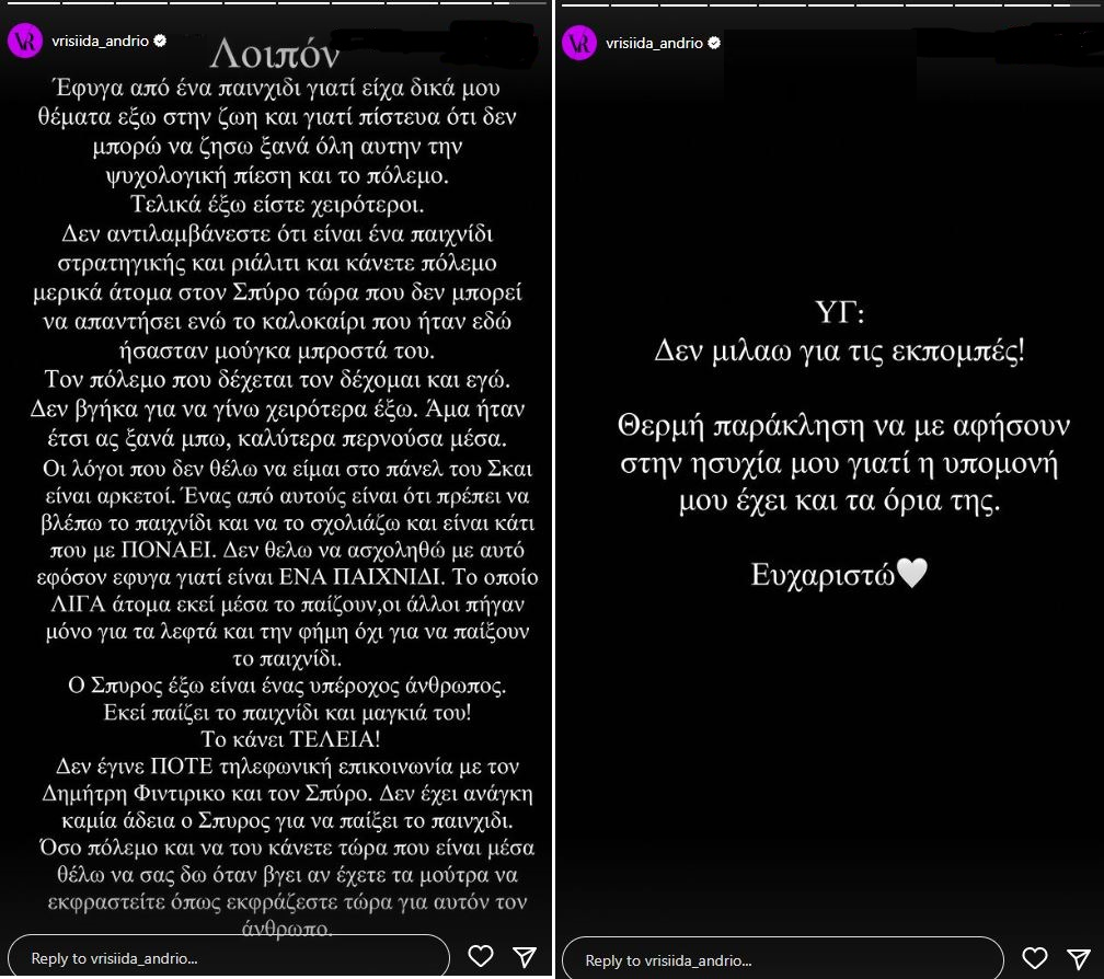 Ο Σπύρος έξω είναι ένας υπέροχος άνθρωπος. Εκεί παίζει το παιχνίδι και μαγκιά του. Το κάνει τέλεια. Δεν έγινε ποτέ τηλεφωνική επικοινωνία με τον Δημήτρη Φιντιρίκο και τον Σπύρο. Δεν έχει ανάγκη καμία άδεια ο Σπύρος για να παίξει το παιχνίδι. Όσο πόλεμο και να του κάνετε τώρα που είναι μέσα, θέλω να σας δω όταν θα βγει, αν έχετε τα μούτρα να εκφραστείτε, όπως εκφράζεστε τώρα για αυτόν τον άνθρωπο» έγραψε η Βρισηίδα Ανδριώτου.