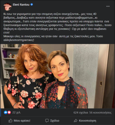«Κι ενώ τα γυρίσματα για την επόμενη σεζόν συνεχίζονται μες τους 40 βαθμούς κάτι ανόητα σεξιστικά περί μαλλιοτραβηγμάτων…. κι αναρωτιέμαι… Γιατί όταν συνεργάζονται γυναίκες πρέπει να υπάρχει πάντα ένα ξεκατίνιασμα κατά τους ανοήτως γράφοντες; Πόσο σεξιστικό! Πόσο παλιό… πόσο θλιβερή κι εξευτελιστική αντίληψη για τις γυναίκες! Όχι ρε φίλε! Δεν συμβαίνει έτσι!