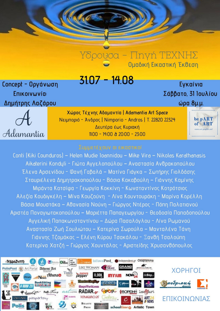 Η ομαδική εικαστική έκθεση ΥΔΡΟΥΣΑ – πηγή Τέχνης σας καλεί να επισκεφτείτε τον όμορφο και φιλόξενο χώρο τέχνης Αδαμαντία στο Νειμποριό της Άνδρου στον οποίο φιλοξενούνται έργα 40 σύγχρονων εικαστικών που αναδεικνύουν τη σύγχρονη εικαστική σκηνή στην Ελλάδα που ανθεί παρά τις αντιξοότητες των τελευταίων ετών.